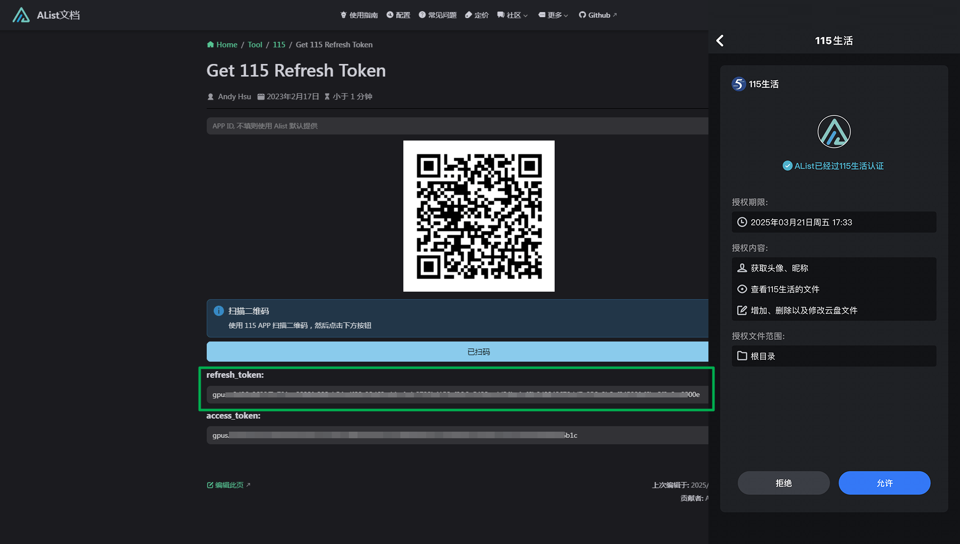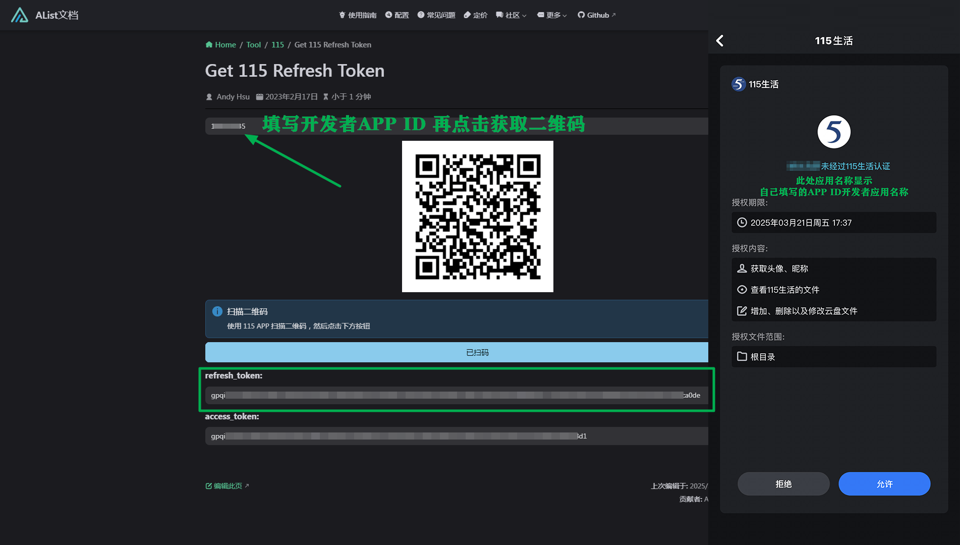 Scan the QR code with your phone and click the blue button to get refresh token