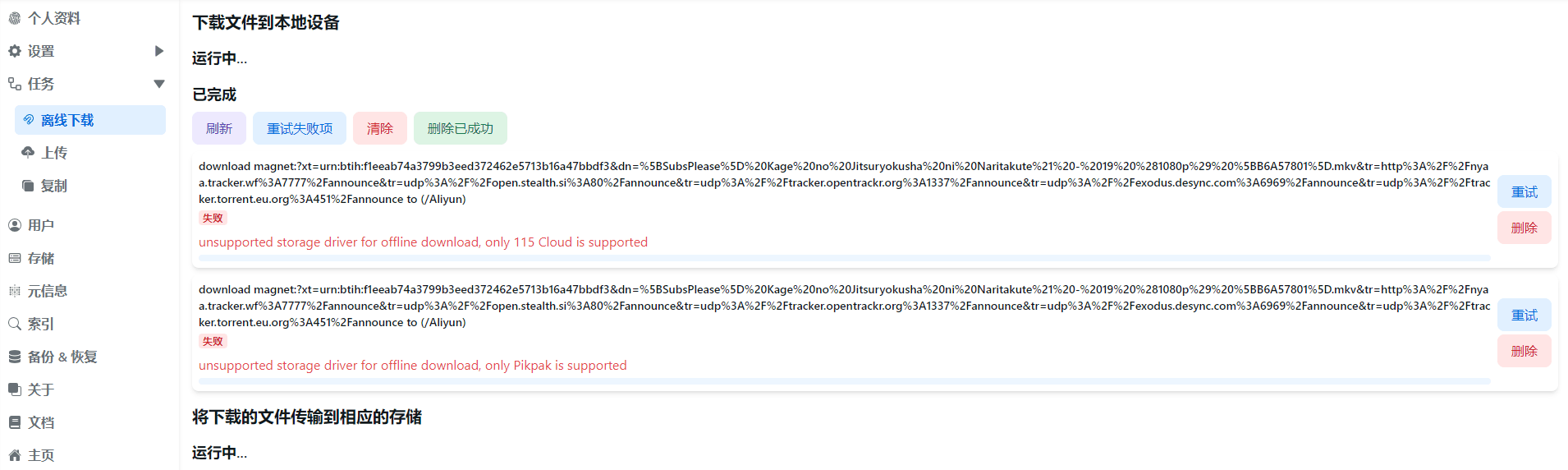 Only Pikpak is supported for offline download. If it is not Pikpak, the following error message will be displayed, Although the offline download prompt was successfully added, an error will be prompted in the background.